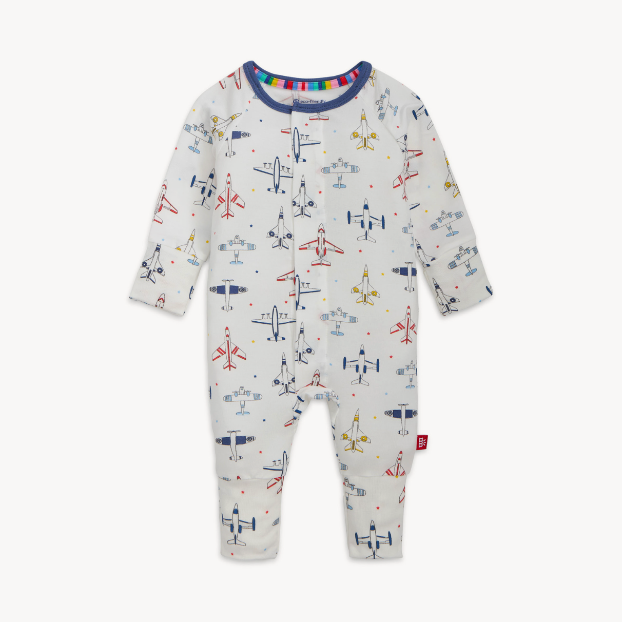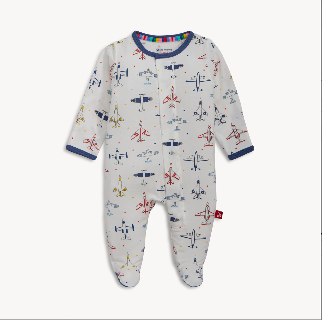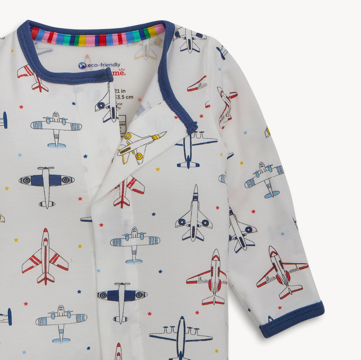 - Magnetic closures: magnets line the seam from the neck to upper thigh for sizes up to 0-3m & from neck to crotch for sizes 3-6m and up.