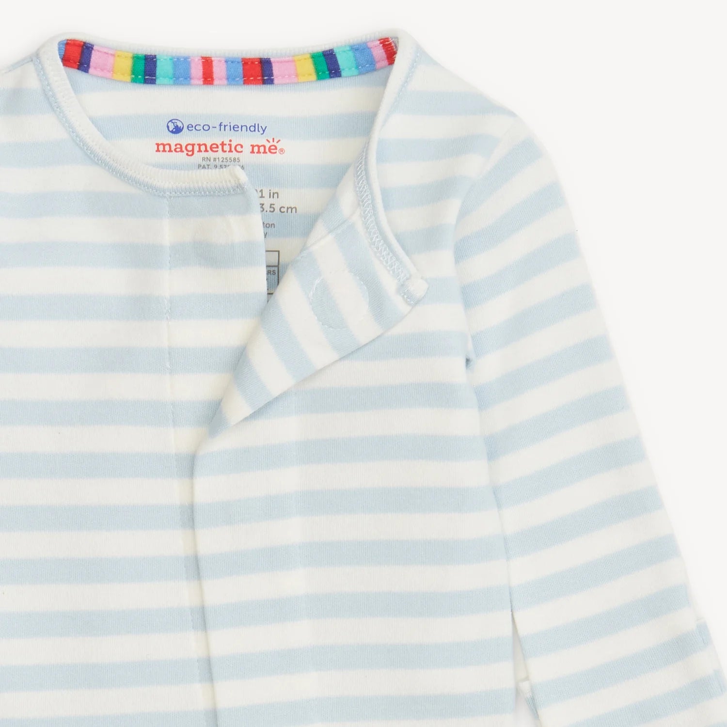 - Magnetic closures: magnets line the seam from the neck to upper thigh for sizes up to 0-3m & from neck to crotch for sizes 3-6m and up.
