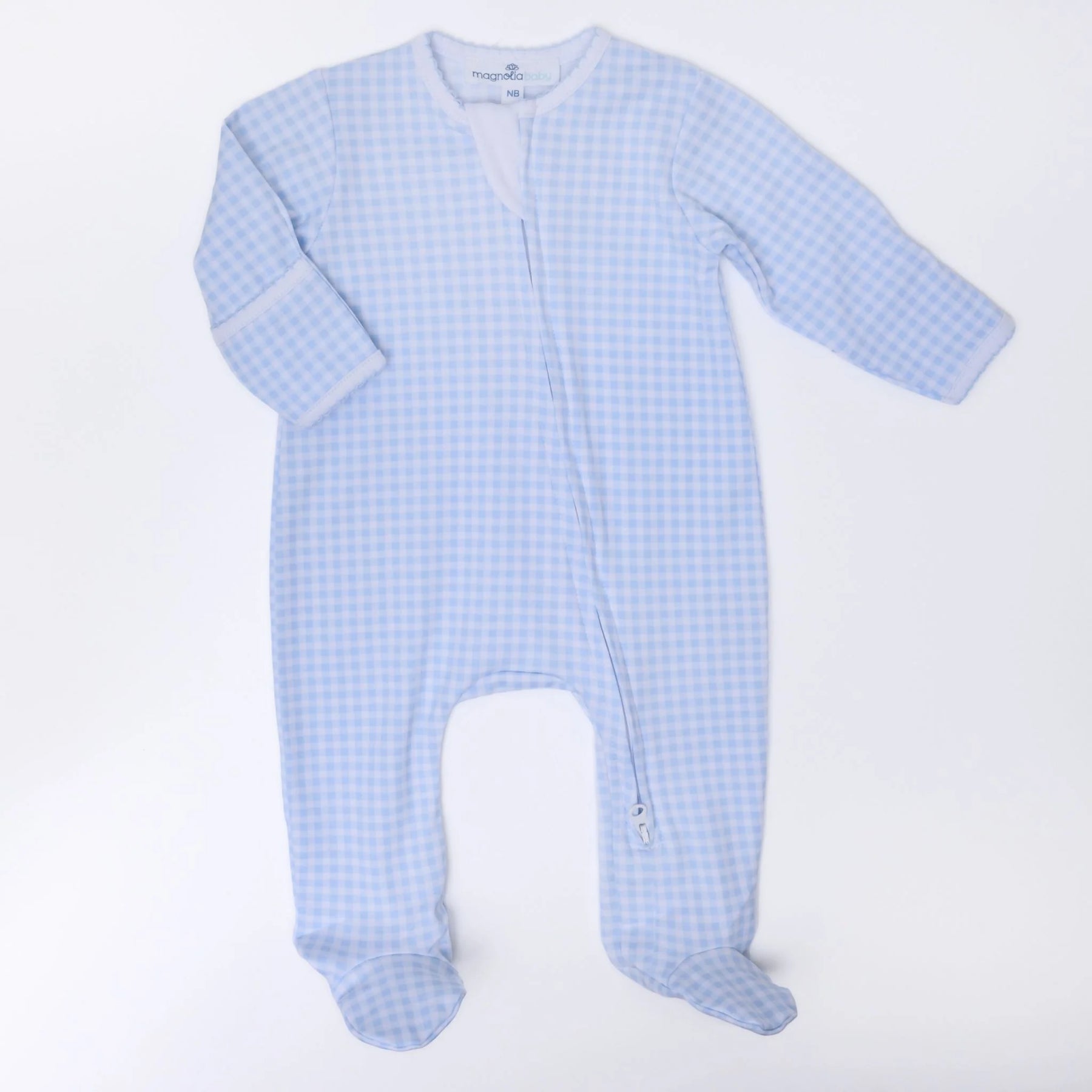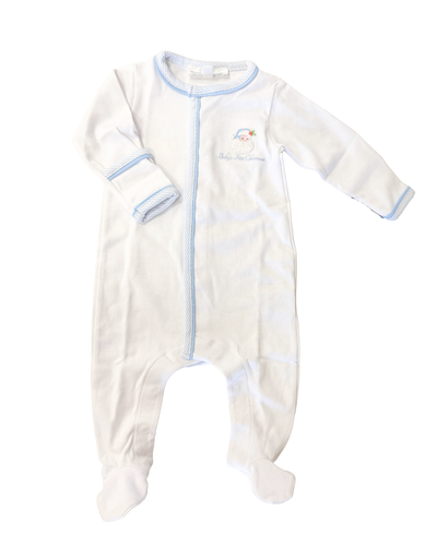 Celebrate a special milestone with our Santa Baby Embroidered Baby's First Christmas Footie - Light Blue. Inspired by the joyful spirit of Santa Claus, this charming white footie, crafted from luxurious Pima Cotton, features festive embroidery, making it a treasured keepsake for his first holiday.