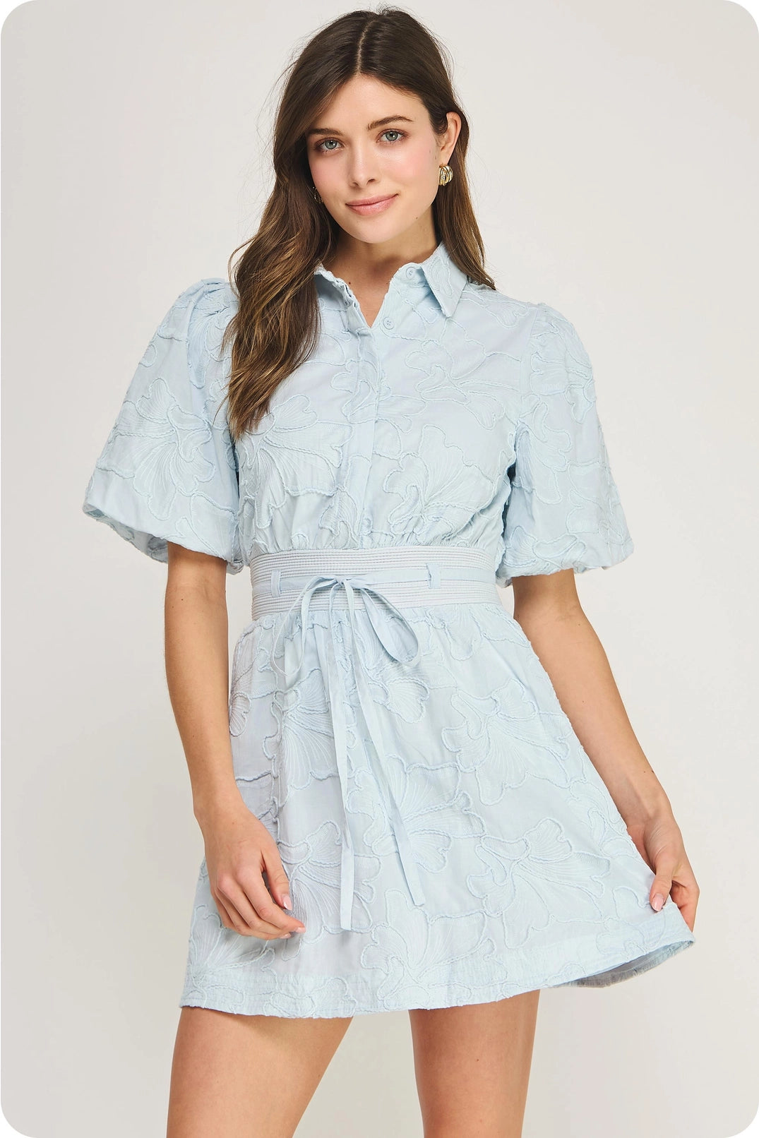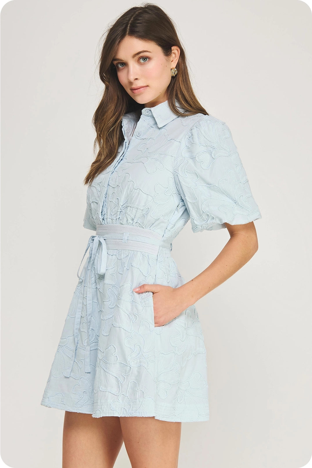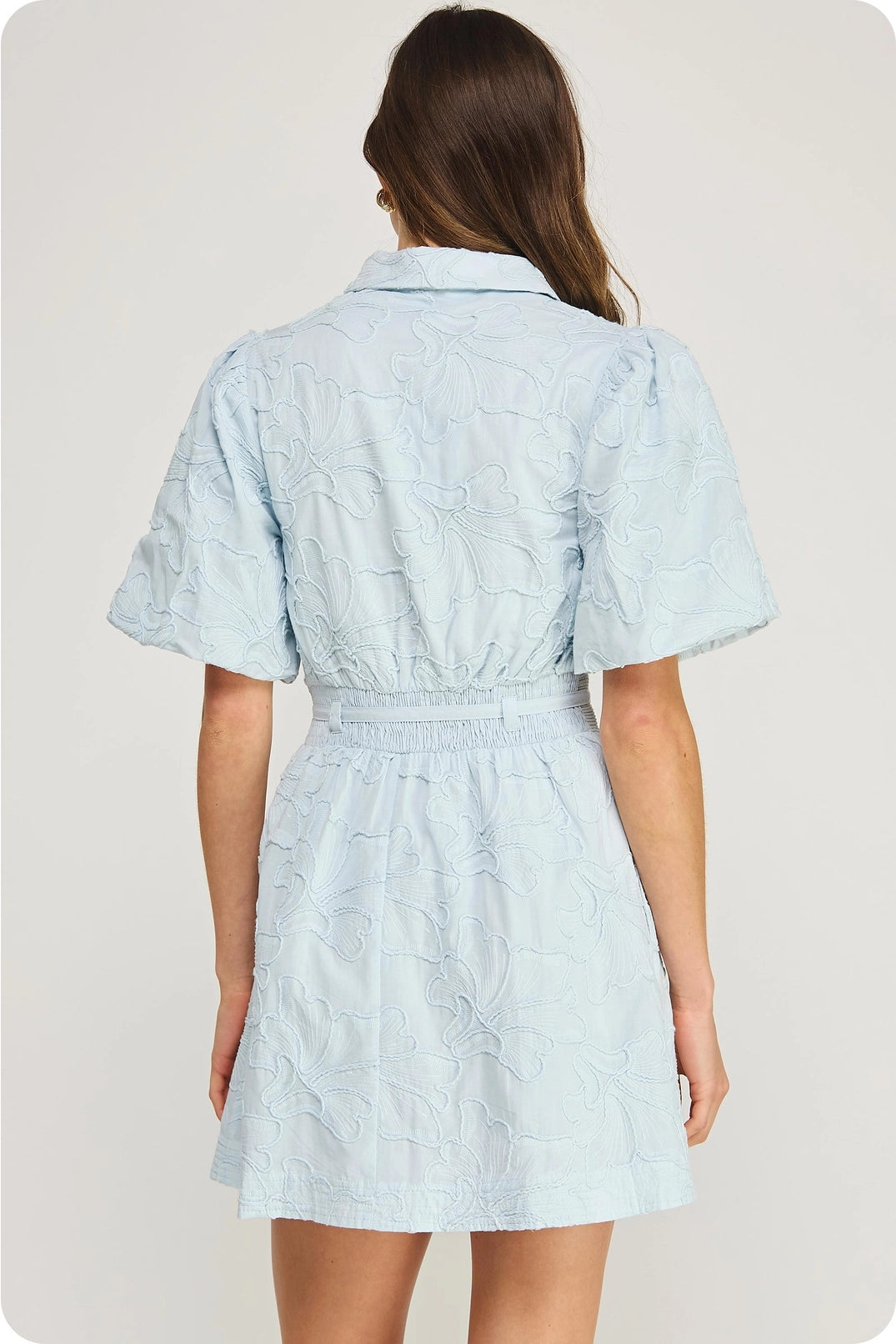 • Blue floral embroidered dress with puff sleeves and waist tie