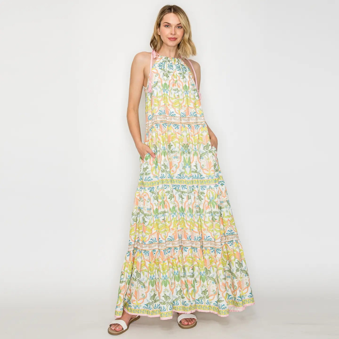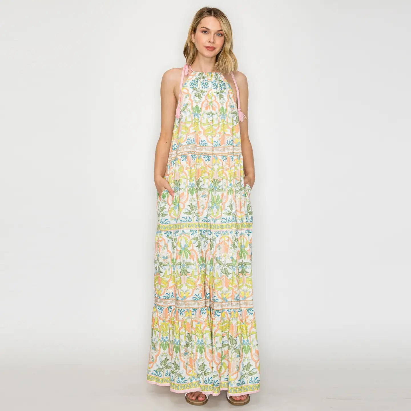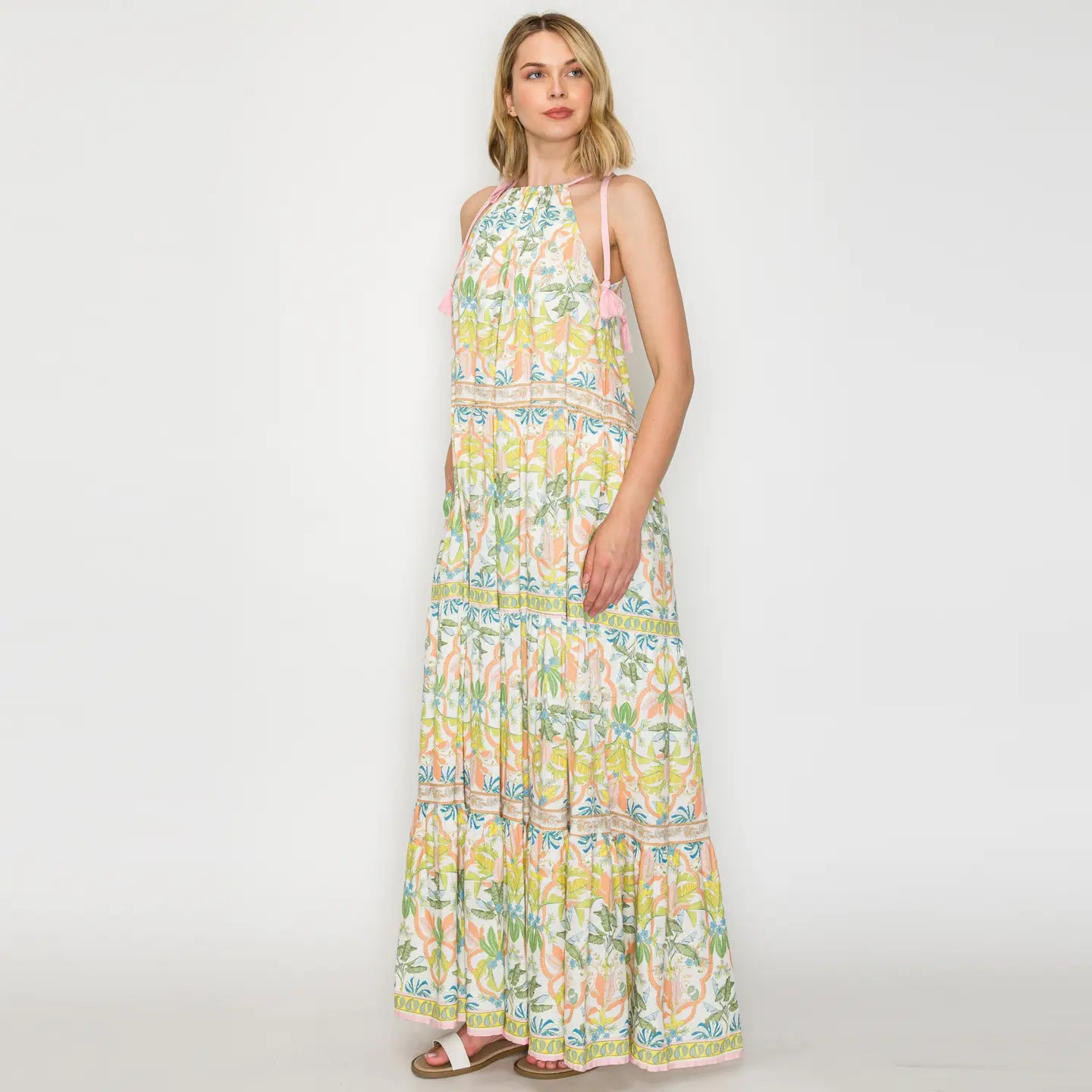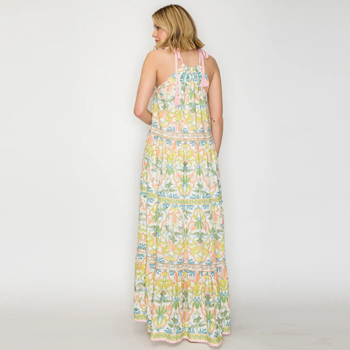 • Yellow patterned maxi dress with halter neckline with tassel detailing