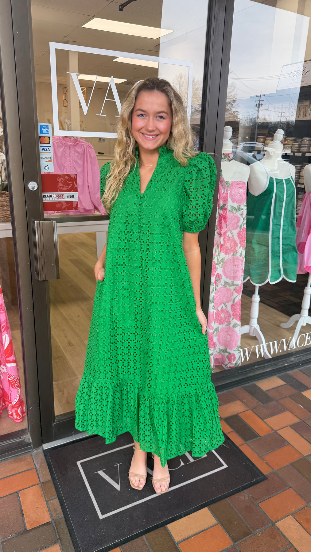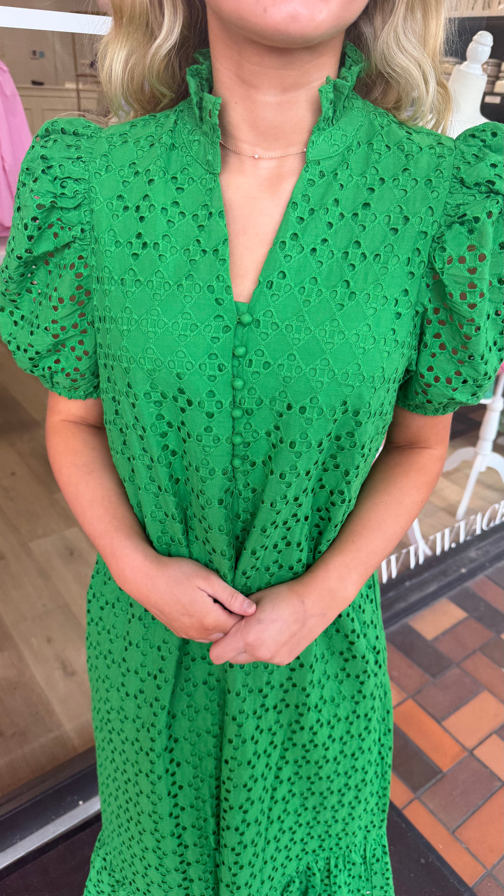 • Eyelet short puff sleeve midi dress featuring ruffled mock neck and ruffle hem