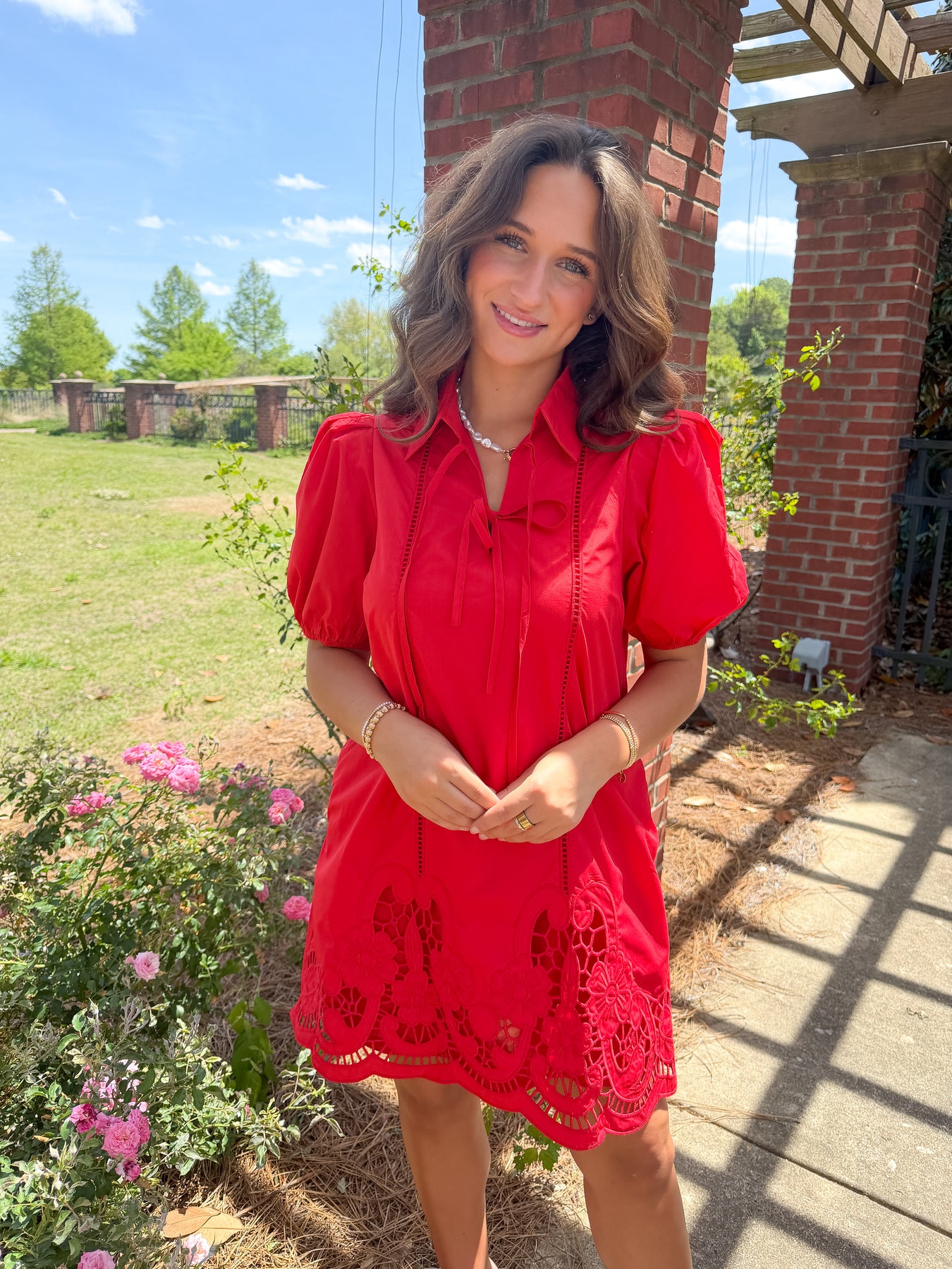 • Solid short puff sleeve mini dress featuring scalloped floral cutout hem