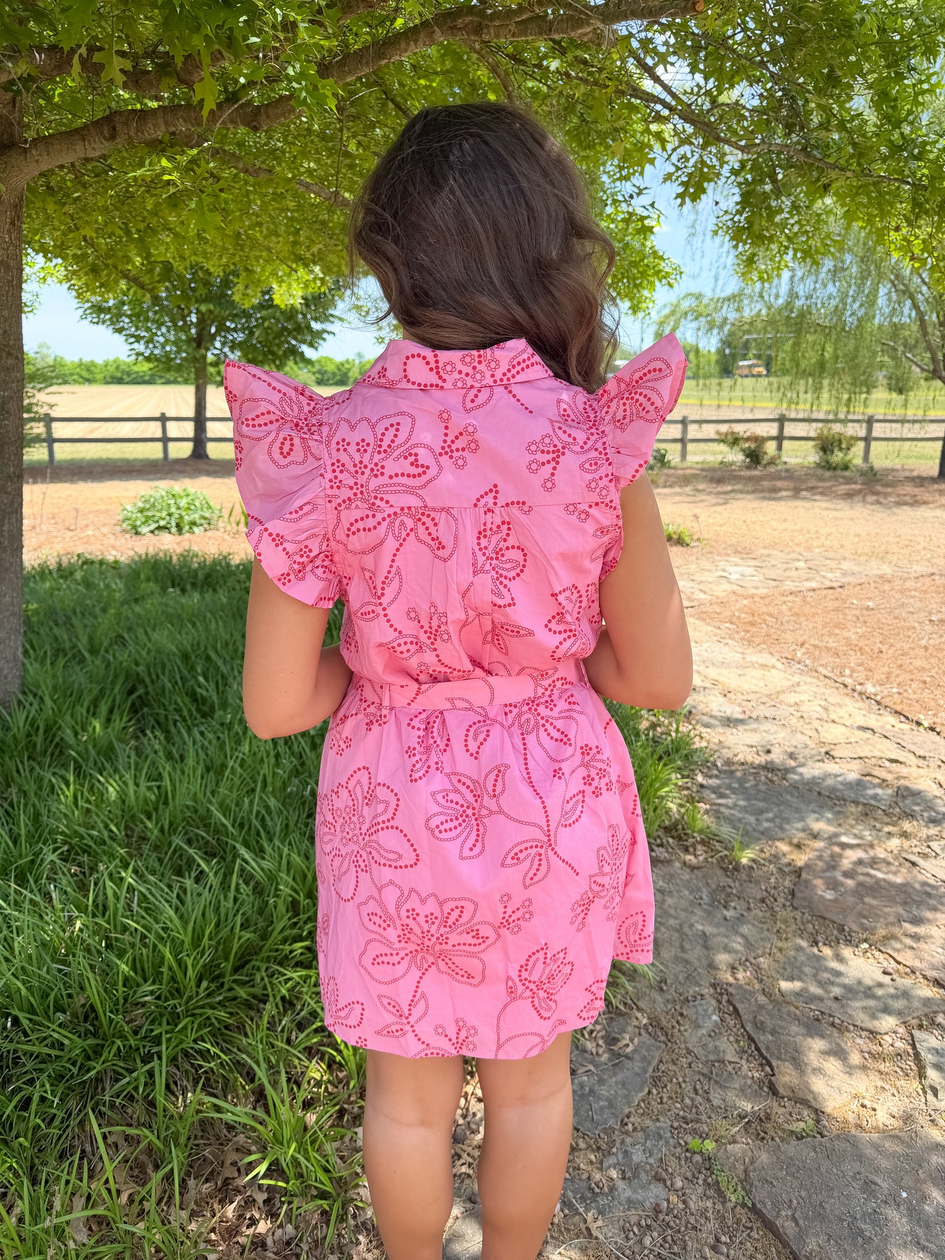 • Floral print ruffle cap sleeve mini dress featuring belted waist and front button placket